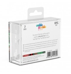 Los sets de dados RPG (para juegos de rol) consisten en 7 dados diferentes: D4, D6, D8, D10 (unidades), D10% (decenas), D12 y D20.